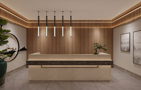 上海裝潢公司案例:與辦公室設(shè)計(jì)不同,此類(lèi)空間用灰色石材與木色格柵遙相呼應(yīng),彌散出絲絲的東方意蘊(yùn),墻面著以燈光嵌入其間,宛如初春的金陵。