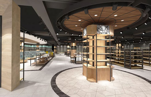 上海裝修公司案例:大空間設(shè)計(jì)將商品展示以精品室的陳列方式呈現(xiàn),利用中島式的試吃臺(tái)將動(dòng)線(xiàn)劃分開(kāi)來(lái)。