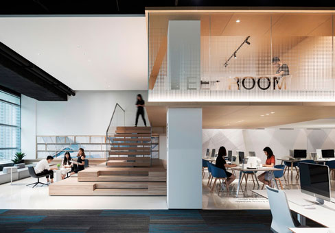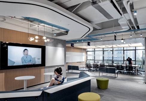 上海辦公室裝修公司案例:不同的材料和照明為每個(gè)層次和活動(dòng)帶來(lái)溫暖和個(gè)性。循環(huán)模式提供了各種移動(dòng)和居住空間的體驗(yàn)。